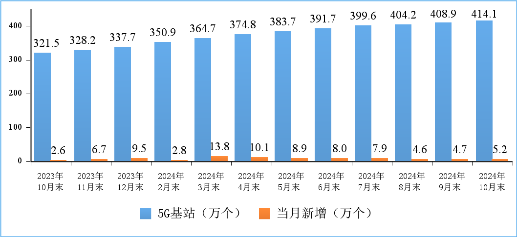 前10个月,通信业整体运行平稳。电信业务收入保持正增长,新兴业务持续发挥拉动作用;5G、千兆光网、物联网等网络基础设施建设稳步推进,连接用户规模持续扩大,移动互联网接入流量较快增长。 电信业务量收保持稳步增长。前10个月,电信业务收入累计完成14535亿元,同比增长2.6%。按照上年不变价计算的电信业务总量同比增长10.4%。固定互联网宽带业务收入平稳增长。前10个月,三家基础电信企业完成互联网宽带业务收入2279亿元,同比增长4.3%,占电信业务收入的15.7%,占比较前三季度提升0.1个百分点,拉动电信业务收入增长0.7个百分点。